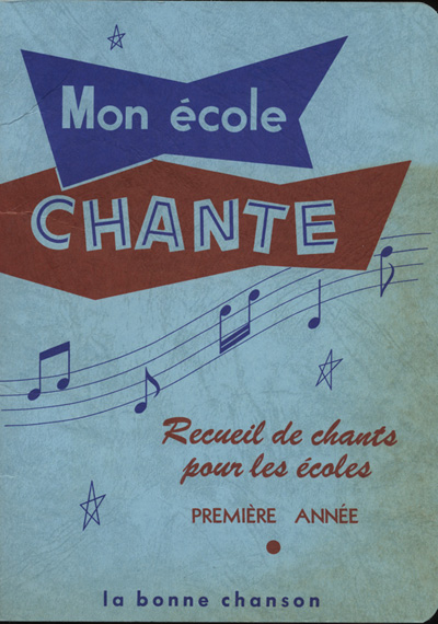 Page couverture de Mon école chante. Recueil de chants pour les écoles, première année, publié sous la direction de Joseph Beaulieu, 1964. Université d'Ottawa, CRCCF, Fonds Jules-Martel (P161), P161/1/1. | |||||||
