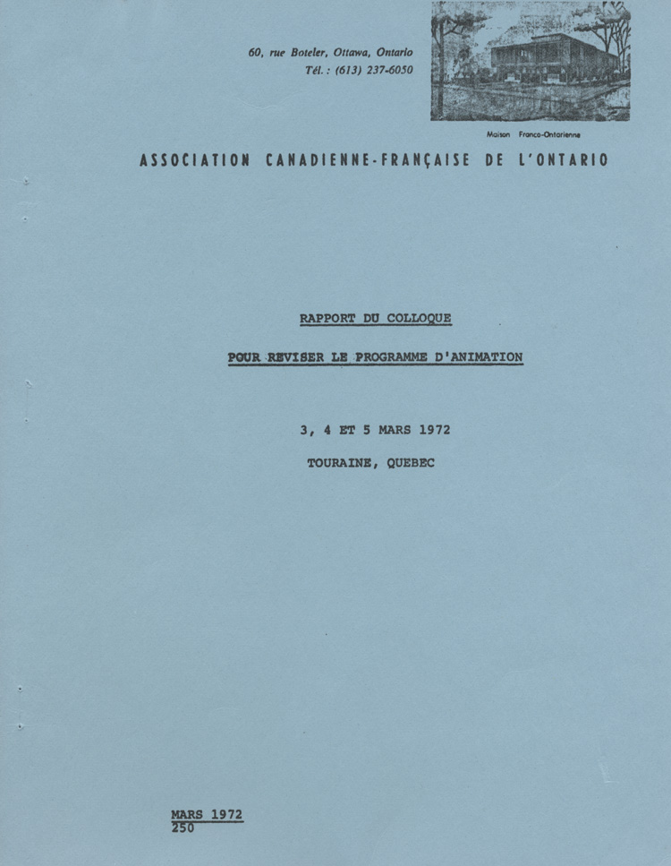 Rapport du colloque pour réviser le programme d'animation, les 3, 4 et 5 mars 1972, à Touraine (Gatineau, Québec), page de titre, 1972.