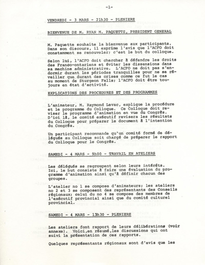 Rapport du colloque pour réviser le programme d'animation, les 3, 4 et 5 mars 1972, à Touraine (Gatineau, Québec), p. 1, 1972. Université d'Ottawa, CRCCF, Fonds Association canadienne-française de l'Ontario (C2), C2/278/2.