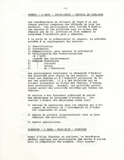 Rapport du colloque pour réviser le programme d'animation, les 3, 4 et 5 mars 1972, à Touraine (Gatineau, Québec), p. 3, 1972. Université d'Ottawa, CRCCF, Fonds Association canadienne-française de l'Ontario (C2), C2/278/2.