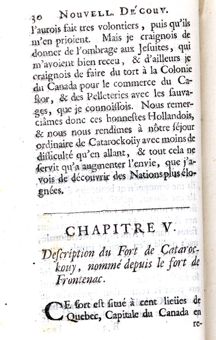 Père Louis Hennepin, « Description du Fort de Catarackoui, nommé depuis le Fort Frontenac », 5e chapitre de Nouvelle découverte d'un très grand pays situé dans l'Amérique, entre le Nouveau Mexique et la mer glaciale : avec les cartes & les figures nécessaires & de plus l'histoire naturelle & morale, & les avantages qu'on en peut tirer par l'établissement des colonies : le tout dédié à Sa Majesté Britannique Guillaume III, Utrecht, Chez Guillaume Broedelet, 1697, p. 30.