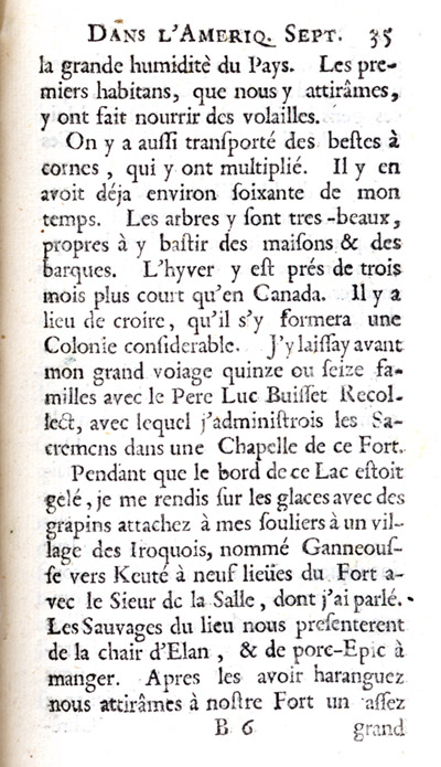 Père Louis Hennepin, « Description du Fort de Catarackoui, nommé depuis le Fort Frontenac », 5e chapitre de Nouvelle découverte d'un très grand pays situé dans l'Amérique, entre le Nouveau Mexique et la mer glaciale : avec les cartes & les figures nécessaires & de plus l'histoire naturelle & morale, & les avantages qu'on en peut tirer par l'établissement des colonies : le tout dédié à Sa Majesté Britannique Guillaume III, Utrecht, Chez Guillaume Broedelet, 1697, p. 35. |