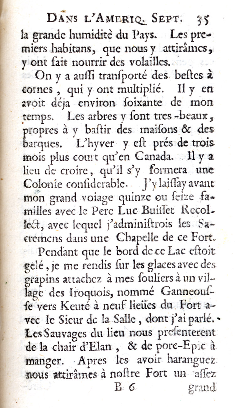 Père Louis Hennepin, « Description du Fort de Catarackoui, nommé depuis le Fort Frontenac », 5e chapitre de Nouvelle découverte d'un très grand pays situé dans l'Amérique, entre le Nouveau Mexique et la mer glaciale : avec les cartes & les figures nécessaires & de plus l'histoire naturelle & morale, & les avantages qu'on en peut tirer par l'établissement des colonies : le tout dédié à Sa Majesté Britannique Guillaume III, Utrecht, Chez Guillaume Broedelet, 1697, p. 35.